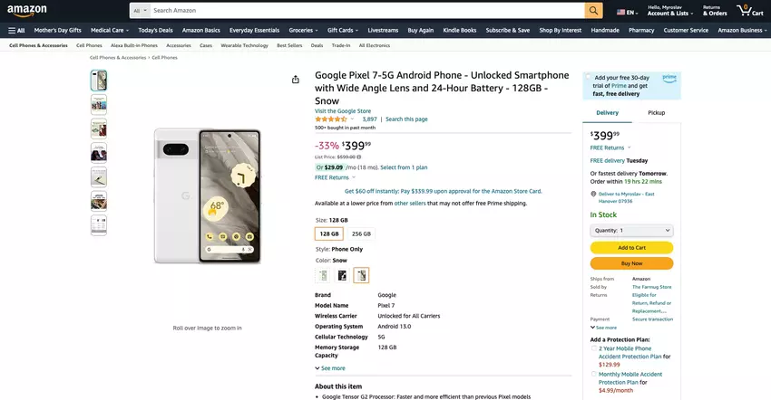 - Pixel 7, 256 GB (Snow, Obsidian) - $399.99.