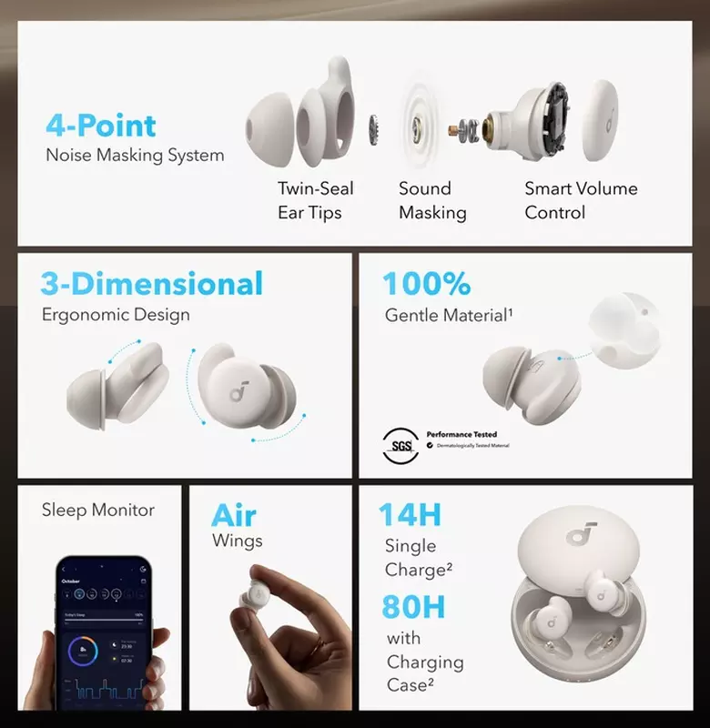 Es handelt sich um den Soundcore Sleep A20 (Nachfolger des Soundcore Sleep A10) mit Schlafmodus. Die Kopfhörer sind in der Lage, die Qualität des Schlafes des Benutzers zu verfolgen.