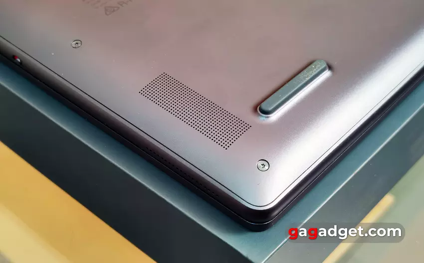 Die untere Abdeckung des Lenovo Yoga Pro 9 16IRP8 ist recht vertraut: viele Lüftungslöcher, massive Gummifüße, die ein Verrutschen verhindern, und Lautsprecheröffnungen. Es gibt keinen besonderen Grund, das Notebook zu öffnen: Man kann nur die SSD austauschen. Der Netzwerkadapter und der Arbeitsspeicher sind auf der Platine verlötet.