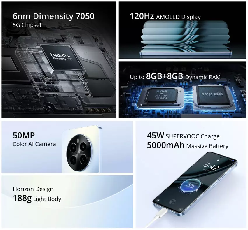 Das Smartphone hat das gleiche Design, aber andere Spezifikationen. Das Gerät wurde mit einem AMOLED-Display ausgestattet. Das Panel hat eine Auflösung von Full HD +, eine Bildwiederholrate von 120 Hz und eine Spitzenhelligkeit von 2000 nits. Die Neuheit wird von einem MediaTek Dimensity 7050 Prozessor angetrieben und von einem 5000 mAh Akku versorgt. Das Gerät kann mit 45 W aufgeladen werden.