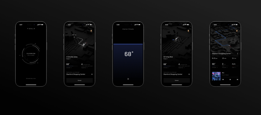 Tesla zeigte eine Reihe von Bildern der zukünftigen Funktion. Der erste zeigt eine große Schaltfläche "Anrufen" und gibt die ungefähre Wartezeit an. Der nächste Bildschirm zeigt eine 3D-Karte mit einem virtuellen Modell des Fahrzeugs, das sich auf dem Weg zum Kunden befindet.
