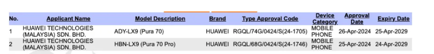 Die Smartphones Huawei Pura 70 und Pura 70 Pro wurden auf der SIRIM-Website in Malaysia mit den Modellnummern ADY-LX9 bzw. HBN-LX9 gesichtet. Dies bestätigt, dass es bereits globale Modelle gibt.
