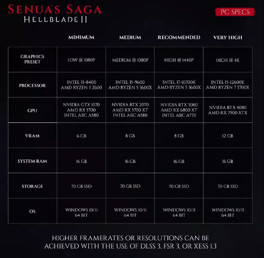 Wie erwartet, wird Hellblade II ein recht anspruchsvolles Spiel sein, das bei minimalen Einstellungen auch Besitzer von leistungsschwachen PCs ausführen können, aber um die ganze Schönheit des alten Islands in vollen Zügen genießen zu können, braucht man den modernsten Computer.