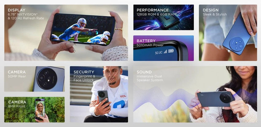 Das TCL 50 XL 5G verfügt über ein 6,78 Zoll großes IPS-Display mit einer Auflösung von 2460 x 1080 Pixeln, einem Seitenverhältnis von 20:9 und einer Bildwiederholfrequenz von 120 Hz. Das Smartphone wird von einem MediaTek Dimensity 6100 Plus-Prozessor, 6 GB RAM und 128 GB integriertem Speicher angetrieben. Nutzer können den Speicher auch mit einer MicroSD-Karte erweitern.