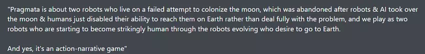 Laut dem maßgeblichen Insider Dusk Golem in seinem Discord-Kanal wird die Handlung von Pragmata von zwei Robotern handeln, die auf einer Mondkolonie festsitzen und zur Erde zurückkehren wollen, wo aber niemand auf sie wartet.
