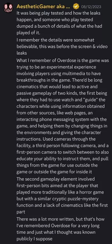 Ende 2022 sickerte Filmmaterial zu einem mysteriösen Overdose-Spiel, das angeblich von Kojima stammt, ins Internet. Dusk Golem erklärte, das Leck sei möglich gewesen, weil die Entwickler die ersten Tests von OD durchführten und die Meinungen der Spieler dazu sammelten. Folglich wurde beiläufig bestätigt, dass es sich bei OD tatsächlich um Overdose handelt.