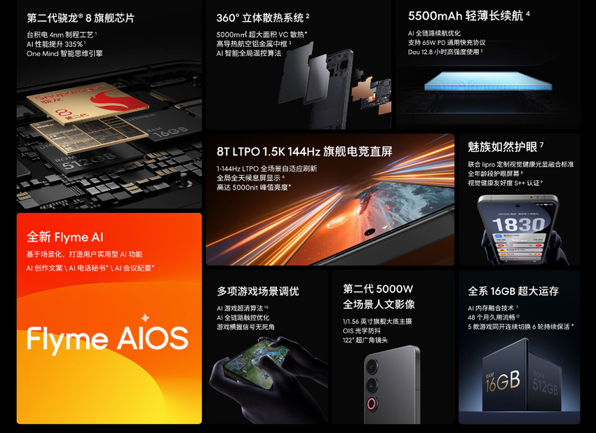 Das Smartphone läuft mit dem Betriebssystem Flyme AIOS, das generative KI-Funktionen wie Anrufscreening, Echtzeit-Übersetzung und Terminbuchung bietet. Die KI von Meizu ermöglicht außerdem die Round-Robin-Suche, die Zusammenfassung von Dokumenten und die Übersetzung von Sprachnotizen in Text.