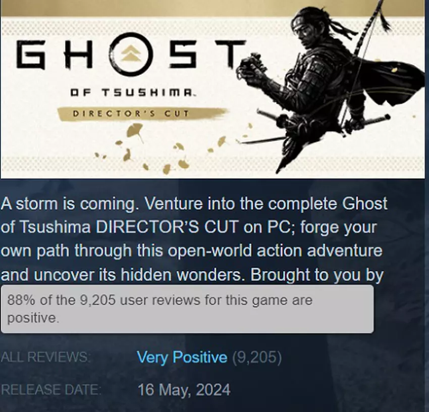 Dank der exzellenten technischen Umsetzung und der anfänglichen Top-Qualität hat Ghost of Tsushima 88% positives Feedback auf Steam.