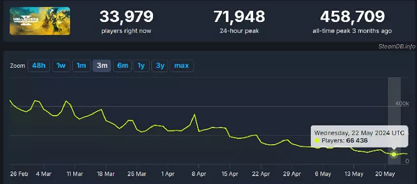 In den ersten Monaten meldeten sich täglich Hunderttausende von Spielern an und erreichten einen Spitzenwert von 458.709 Online-Spielern. Die SteamDB-Statistiken zeigen jedoch, dass das Interesse an Helldivers 2 allmählich nachlässt.