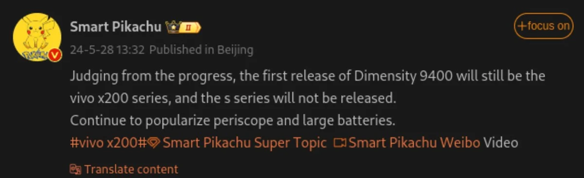 Insider Smart Pikachu hat berichtet, dass die Vivo X200-Serie von Smartphones die ersten sein werden, die mit dem MediaTek Dimensity 9400-Chipsatz ausgestattet sind. Vivo hat bereits als erstes Unternehmen den Dimensity 9300 im X100 und X100 Pro sowie den neuen Dimensity 9300 Plus Chip in den X100s und X100s Pro Smartphones eingesetzt.