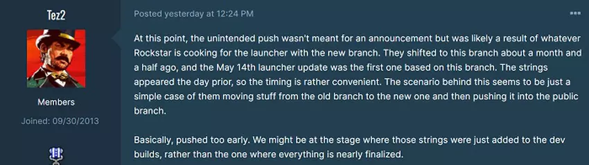 Tez2 vermutet, dass die Linie, die er im Code der Website gesehen hat, das Ergebnis der internen Arbeit des Studios ist, um Daten von einem Zweig in einen anderen in seinem Launcher zu verschieben.