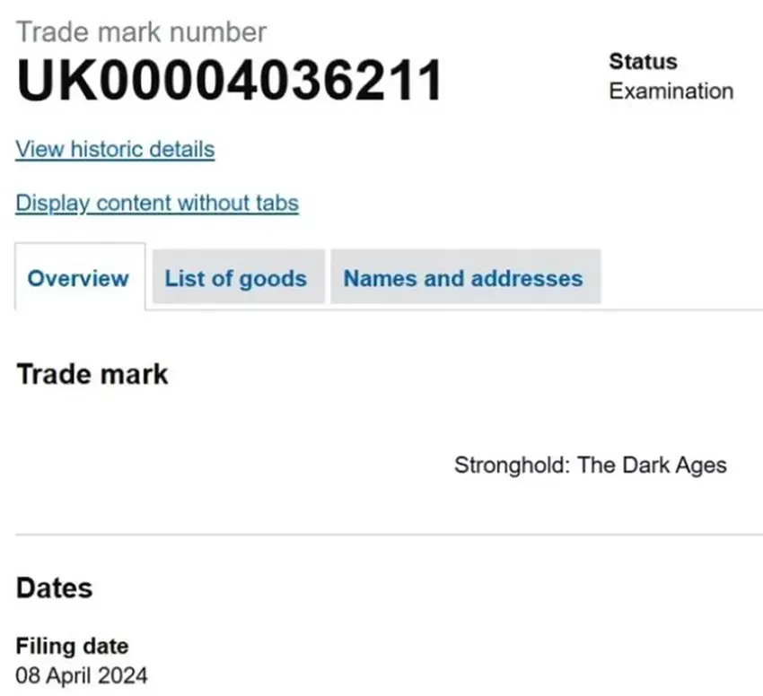 Im Netz war zu lesen, dass das Studio bereits im April einen Antrag auf Eintragung der Marke Stronghold eingereicht hat: The Dark Ages gestellt hat, der derzeit geprüft und verifiziert wird.