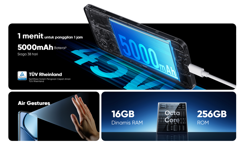 Das Modell wurde realme C63 genannt. Das Gerät erhielt ein 6,74-Zoll-Display mit HD+-Auflösung, LCD-Matrix, einer Bildwiederholfrequenz von 90 Hz und einer Spitzenhelligkeit von 560 nits. Eine U-förmige Aussparung mit einer 8-MP-Frontkamera wurde am oberen Rand des Panels angebracht. Die Hauptkamera hat eine rechteckige Einheit im iPhone-Stil und zwei 50 MP + 2 MP Sensoren.