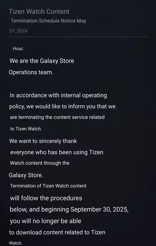 Laut dem vom Reddit-Nutzer Seaweed_Maximum veröffentlichten Zeitplan wird der Verkauf von kostenpflichtigen Inhalten für Tizen-Uhren am 30. September 2024 eingestellt. Bis zum 31. Mai 2025 wird die Möglichkeit, kostenlose Anwendungen herunterzuladen, ganz eingestellt.