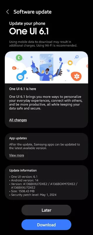 Die neue Softwareversion enthält den Google-Sicherheitspatch vom Mai sowie verschiedene Neuerungen der One UI 6.1. Zum Beispiel eine leicht aktualisierte Benutzeroberfläche, verbesserte Marken-Apps, mehrere neue Funktionen usw. Im Gegensatz zu den Flaggschiff-Geräten verfügt das Galaxy A13 5G nicht über Galaxy AI.