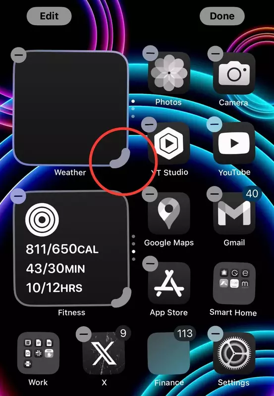 Nach dem Umschalten des Homescreens in den "Swipe-Modus" sehen Nutzer eine neue Markierung in der unteren rechten Ecke, mit der sie die Größe von Widgets durch Ziehen ändern können.