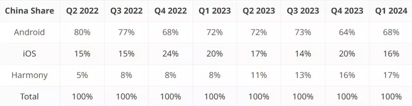 Im ersten Quartal dieses Jahres hat HarmonyOS zum ersten Mal iOS überholt. Sein Anteil beträgt 17 %, das ist 1 % mehr als das mobile Betriebssystem des amerikanischen Unternehmens Apple. Die Popularität von HarmonyOS hat sich im Vergleich zum gleichen Zeitraum des Vorjahres etwa verdoppelt.