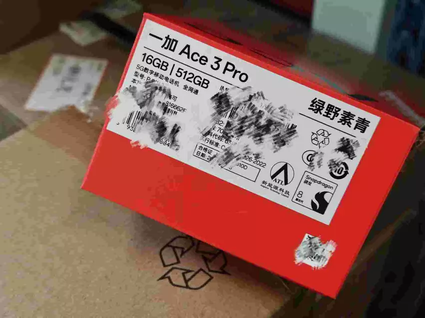 Die OnePlus Ace-Serie ist für ihre starke Leistung bekannt, glänzt aber nicht gerade mit ihrer Kameraqualität. Es wird erwartet, dass das OnePlus Ace 3 Pro von einem Snapdragon 8 Gen 3-Chipsatz angetrieben wird, was durch das Bild der Verpackung bestätigt wird. Das Etikett darauf bestätigt auch eine Variante mit 16 GB RAM und 512 GB eingebautem Speicher.