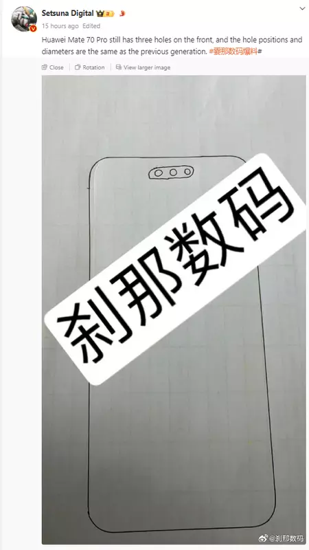 Im Vorfeld der erwarteten Markteinführung der Huawei Mate 70-Serie im dritten Quartal dieses Jahres sind neue Details über das Flaggschiff Mate 70 Pro online aufgetaucht. Laut einem aktuellen Leak des Insiders Setsuna Digital, das auf der Weibo-Plattform veröffentlicht wurde, wird das neue Produkt das charakteristische Design seines Vorgängers Mate 60 Pro beibehalten, einschließlich der drei Löcher.