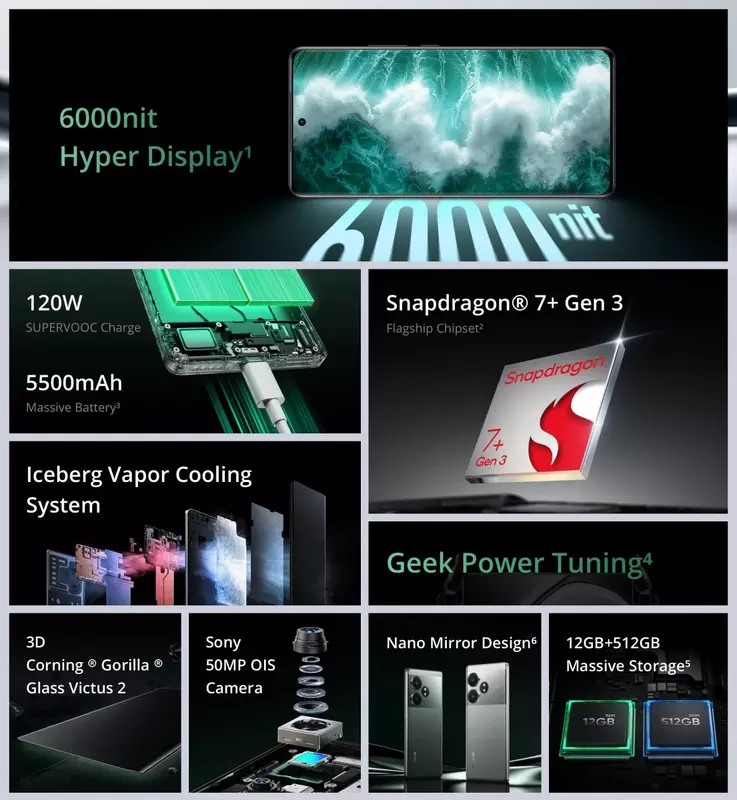 Das Gerät verfügt über einen 5500mAh Akku mit 120W Ladeleistung. Das Smartphone verfügt außerdem über IP65-Schutz, NFC, Stereo-Lautsprecher und einen IR-Sensor zur Steuerung der Technik.