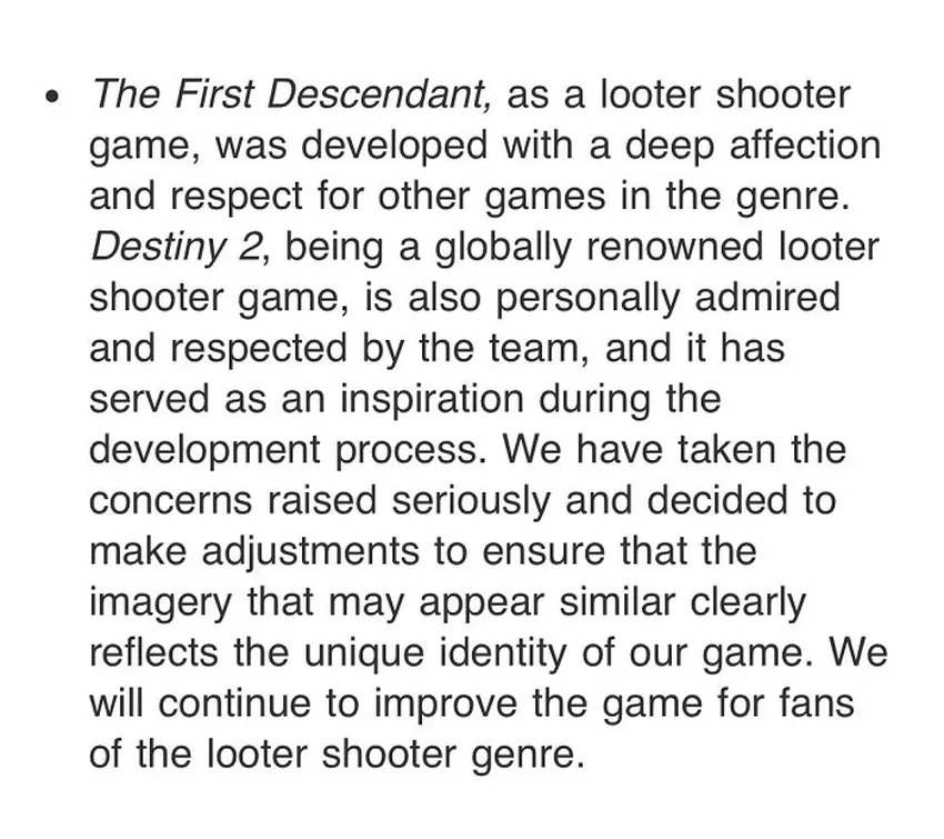 Die Entwickler gaben zu, dass viele Elemente ihres Shooters Komponenten anderer Spiele ähneln. Nexon verspricht, die Assets und Bilder von The First Descendant in naher Zukunft zu ändern, um übermäßige Ähnlichkeiten mit Destiny 2 zu entfernen.