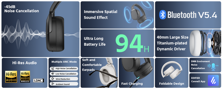 Das Modell wiegt 267 Gramm und verfügt über gepolsterte Ohrpolster sowie einen verstellbaren Kopfbügel. Der Kopfhörer ist mit 40-mm-Treibern ausgestattet und unterstützt den LDAC-Codec sowie Hybrid ANC. Die Neuheit verfügt über einen Gaming-Modus mit niedriger Soundlatenz und einen Spatial-Sound-Modus. Das Gerät verfügt über Bluetooth 5.4 und einen USB-C-Ladeanschluss. Mit einer einzigen Ladung hält das Edifier W830NB bis zu 94 Stunden durch.