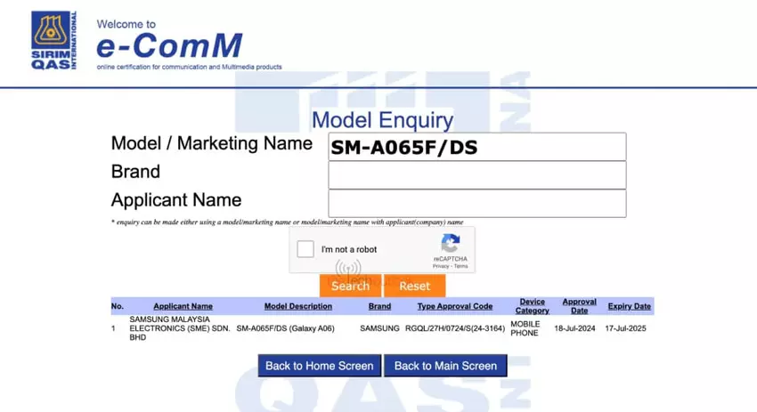 Das Gerät tauchte in der Datenbank der malaysischen Zertifizierungsagentur SIRIM mit der Modellnummer SM-A065F/DS auf. Zuvor war das Galaxy A06 bereits bei der FCC und BIS gesichtet worden.