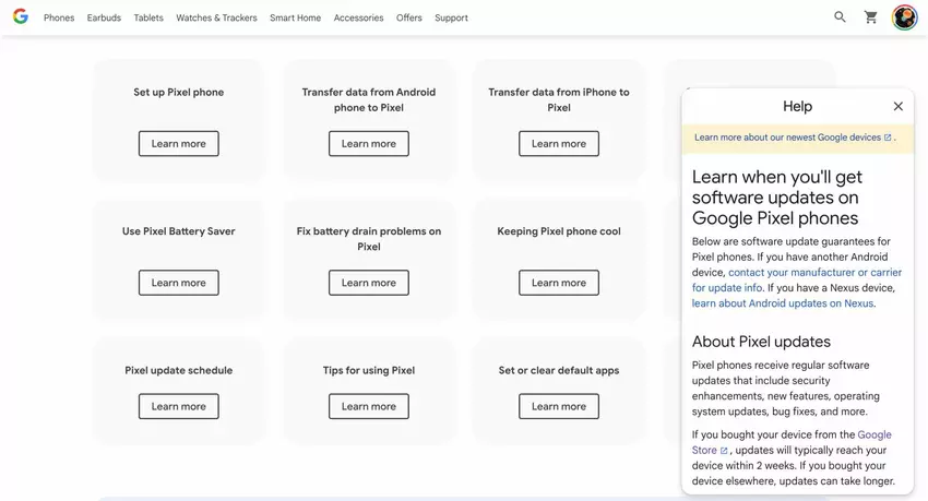 Zuvor war die Support-Option nur im internationalen Google Store verfügbar, wo sie zur Seite support.google.com/store führte, die nur Informationen zu Käufen, Zahlungen und Versand enthielt. Jetzt wurde der Support in den US-Store aufgenommen, neben den Produktkategorien (Telefone, Kopfhörer, Tablets, Uhren und Tracker, Smart Home, Zubehör) und Angeboten.