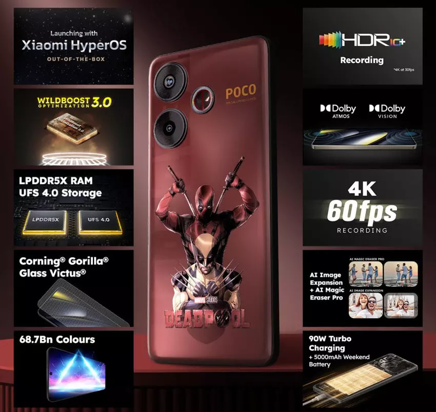 Die Neuheit wurde POCO F6 Deadpool Limited Edition genannt. Das Gadget wurde dem neuen Film "Deadpool und Wolverine" (Deadpool & Wolverine) gewidmet. Das Smartphone erhielt eine rote Gehäusefarbe, Bilder der Hauptfiguren auf der Rückseite und das Deadpool-Logo. Die Neuheit wird in einer Geschenkpackung mit einem erweiterten Paket geliefert. Das Gadget hat ein vorinstalliertes Theme im Stil des Films.