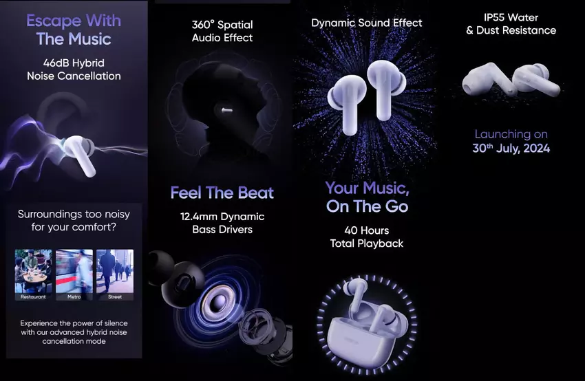 Die realme Buds T310 mit ANC, IP55-Schutz und bis zu 40 Stunden Akkulaufzeit werden am 30. Juli vorgestellt.