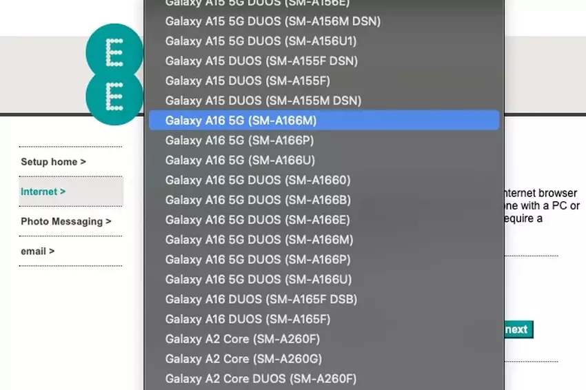 Die Website eines der größten britischen Telekommunikationsanbieter, EE, hat acht Varianten des Galaxy A16 mit den Modellnummern SM-A1660, SM-A166B, SM-A166E, SM-A166M, SM-A166P, SM-A166U, SM-A165F und SM-A165F DSB enthüllt. Das Galaxy A16 wird in 4G- und 5G-Varianten erhältlich sein. Modelle mit "6" vor dem letzten Buchstaben oder der letzten Zahl bezeichnen 5G-fähige Versionen, während die mit "5" 4G- oder LTE-fähige Versionen bezeichnen.