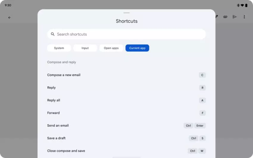 Wenn Sie eine externe Tastatur an Ihr Galaxy Tab oder Galaxy Fold anschließen, stellt Google Mail eine Liste mit nützlichen Tastaturkürzeln zur Verfügung. Um diese Liste anzuzeigen, öffnen Sie Gmail, gehen Sie zum Bildschirm "Verfassen" und drücken Sie die Taste "?" auf Ihrer Tastatur.