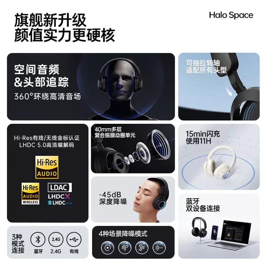 Das Modell heißt Huazai Halo Space. Es verfügt über 40-mm-Dynamiktreiber mit einer mehrschichtigen Verbundmembran, die für tiefe Bässe, sanfte Mitten und klare Höhen bis zu 40 kHz verantwortlich ist. Die Lautsprecher werden durch einen unabhängigen Hohlraum ergänzt, der Außengeräusche isoliert.