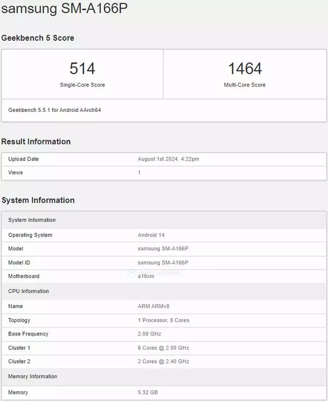 Die Rede ist von dem Galaxy A16 5G. Das Smartphone mit der Modellnummer SM-A166P ist in der Datenbank des Geekbench-Leistungstests aufgetaucht. Dem Bericht zufolge wird das Gerät einen neuen Prozessor erhalten - MediaTek Dimensity 6300. Im Vergleich dazu kommt das Galaxy A15 5G mit dem Dimensity 6100+/Helio G99 Chip (je nach Markt).