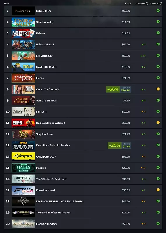 Weitere beliebte Spiele in den Top 20 sind Baldur's Gate III, Hades und Hades II, sowie Cyberpunk 2077 und No Man's Sky.