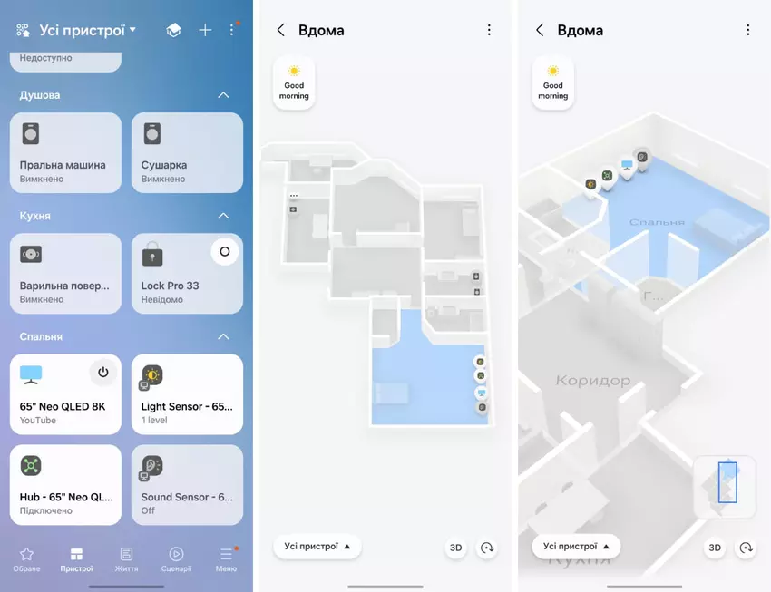 Der Wunsch zu verstehen, wie künstliche Intelligenz im Fernseher funktioniert, hat den Fokus auf die grundlegenden Smart-TV-Funktionen ein wenig verändert. Wir haben uns so sehr an Smart-TVs und die darauf installierten Video-Apps gewöhnt, dass wir sie nicht mehr als etwas Außergewöhnliches ansehen (obwohl das noch vor 10 Jahren nicht so war). Natürlich läuft der Samsung Smart TV mit dem Betriebssystem Tizen und enthält neben Anwendungen und einem Shop für diese auch ein Modul des SmartThings-Ökosystems, das große Chancen hat, das größte der Welt zu werden. Ihr wisst wahrscheinlich alle, wie die SmartThings-App auf einem Smartphone aussieht. Bei mir sieht sie so aus (kürzlich wurde die Möglichkeit hinzugefügt, Raumpläne zu erstellen, was ich bereits genutzt habe). Mehr darüber, was ich bereits habe und was ich plane, wie ich das Ökosystem für meine neue Wohnung ausgewählt habe und was ich über das Smart-Home-Konzept im Jahr 2024 wissen muss, habe ich vor ein paar Tagen in einem anderen Artikel geschrieben.