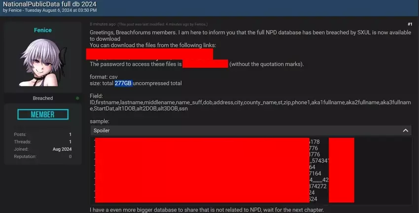 Das Internet wurde durch einen weiteren Hack von einer der größten Datenschutzverletzungen im Internet heimgesucht. Ein Hacker unter dem Pseudonym "Fenice" hat auf der Plattform Breach Forums 2,9 Milliarden Datensätze veröffentlicht, die von der Firma National Public Data gestohlen wurden.