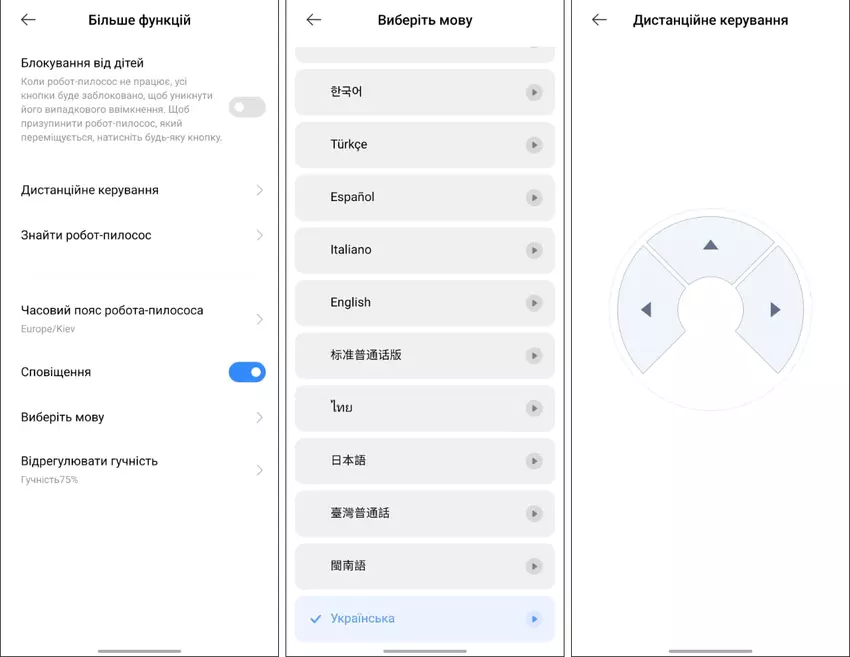 - Im Abschnitt "Weitere Funktionen" der Einstellungen können Sie festlegen, dass die Tasten des Roboters gesperrt werden (damit Kinder ihn nicht starten können), wenn er sich an einer Station befindet. Finden Sie den Roboter im Haus (er meldet sich per Stimme), stellen Sie die Lautstärke ein (die Standardeinstellung ist 75%, und das reicht mir) oder fügen Sie eine Zeitzone hinzu (die Standardeinstellung ist Kiew).