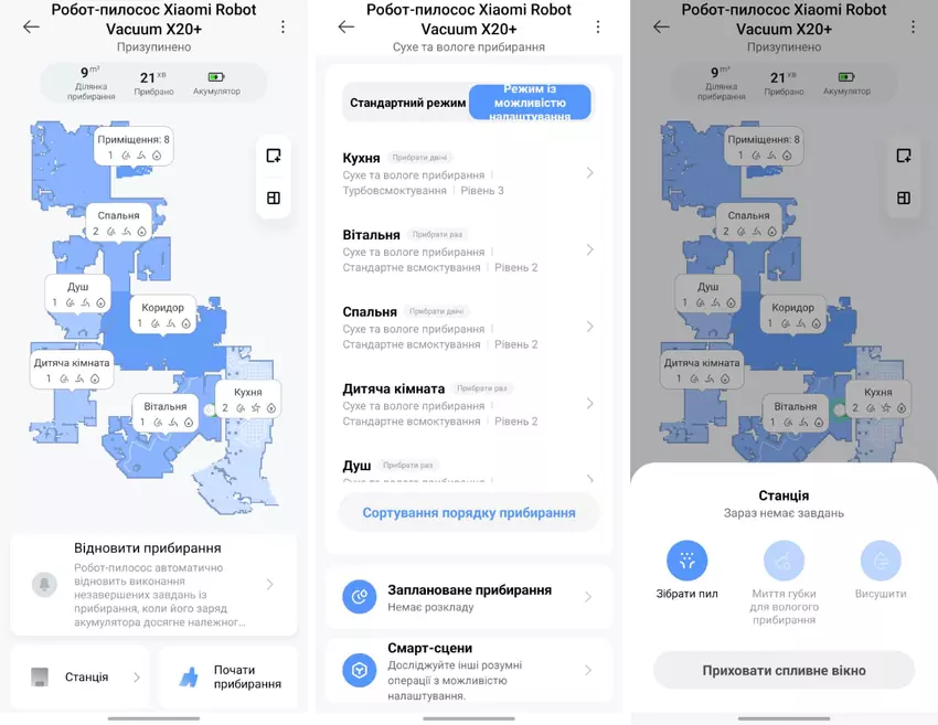 Sehr gut gefallen haben mir die Einstellungen für die Reinigung der einzelnen Räume. Es gibt insgesamt 48 Kombinationen - 4 Reinigungsmodi, 4 Saugstärken und Wasserstände. In der Praxis hat sich gezeigt, dass mir für alle Räume die Standardeinstellungen ausreichen - ich habe nur im Schlafzimmer die doppelte Reinigung und in der Küche die maximale Leistung und die maximale Befeuchtung hinzugefügt (ebenfalls in zwei Durchgängen). Im Allgemeinen war die Reinigung der Küche ein Problem, weil die von mir gewählten Bodenfliesen jeden Tag so schwer zu reinigen waren. Jetzt, dank des Roboters, kann sie einmal pro Woche gereinigt werden, da der Xiaomi X20+ sie ziemlich gut sauber hält. Zwei Besuche pro Tag mit Nassreinigung reichen dafür aus.