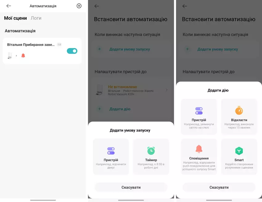 Leider (oder zum Glück) habe ich keine anderen Geräte im Ökosystem, so dass ich keine Gelegenheit habe, die Interaktion des Roboters mit anderen Geräten zu testen. Aber hier ist alles Standard - fügen Sie ein neues Szenario hinzu, geben Sie ihm einen Namen, wählen Sie eine Startbedingung und die Aktion des ausgewählten Geräts. Zu Versuchszwecken habe ich eine Push-Benachrichtigung über das Ende der Reinigung des Wohnzimmers, in dem die Station installiert ist, hinzugefügt.