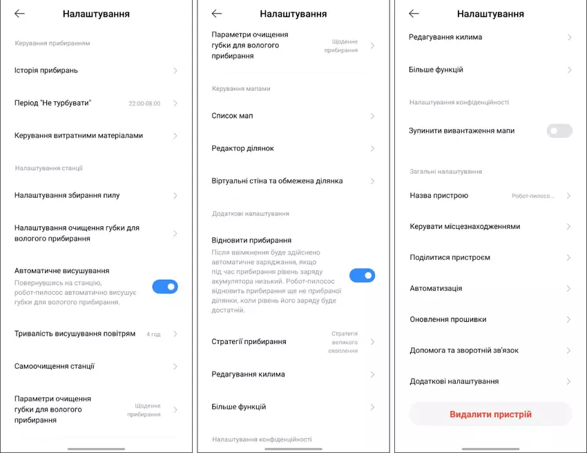 Die Liste der Einstellungen nimmt gleich drei Bildschirme des Smartphones ein. Und das ist wahrscheinlich die umfangreichste Liste von Einstellungen bei Staubsaugerrobotern, die ich je gesehen habe. Das zeigt nur die Klasse des Roboters, der heute zu den Spitzenmodellen gehört. Ich werde all diese Optionen in der Reihenfolge auflisten, in der sie im Menü erscheinen.