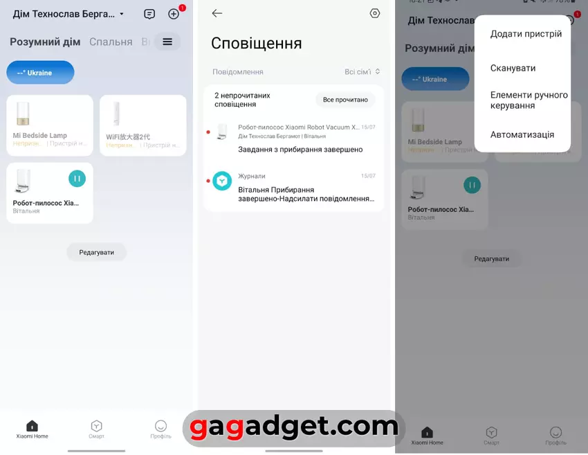 Um mit dem Staubsauger zu arbeiten, benötigen Sie eine Standardanwendung des Xiaomi Ökosystems - Mi Home (es gibt sie für Android und iOS ). Sobald Sie Xiaomi X20+ hinzufügen, erscheint sein Symbol auf dem Startbildschirm. Und die Benachrichtigungen des Roboters werden hinzugefügt. Wie Sie sehen können, habe ich das Xiaomi Ökosystem noch nicht - nur eine alte Lampe, die jetzt nicht benutzt wird, und einen Wi-Fi-Repeater, den ich früher zusammen mit dem Fernseher benutzt habe, um das Signal zu verstärken (jetzt ist das in der neuen Wohnung nicht mehr nötig - die Fernseher sind durch Kabel in den Wänden verbunden).