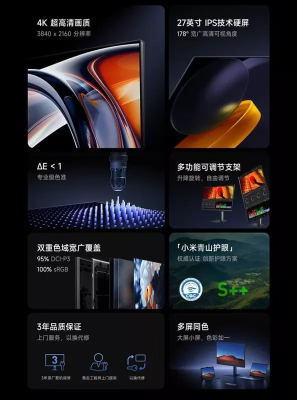 Die Neuheit wurde Redmi Monitor A27U genannt. Das Modell erhielt einen 27-Zoll-IPS-Bildschirm mit einer Bildauflösung von 3840×2160p, einem Blickwinkel von 178 Grad, einer Bildwiederholfrequenz von 60 Hz und einer Reaktionszeit von 6 ms. Der Monitor verfügt über eine professionelle Farbgenauigkeit mit einer ΔE<1-Bewertung, die 95 % des DCI-P3-Farbraums und 100 % des sRGB-Farbraums abdeckt.