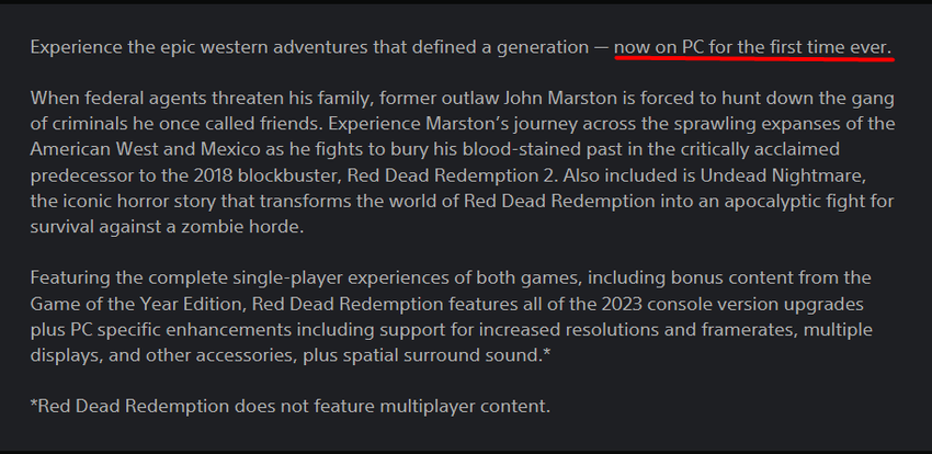 Die Seite des Spiels im PS Store wurde aktualisiert und lautet jetzt: "Erleben Sie das epische Western-Abenteuer, das eine ganze Generation geprägt hat - jetzt zum ersten Mal auf PC."
