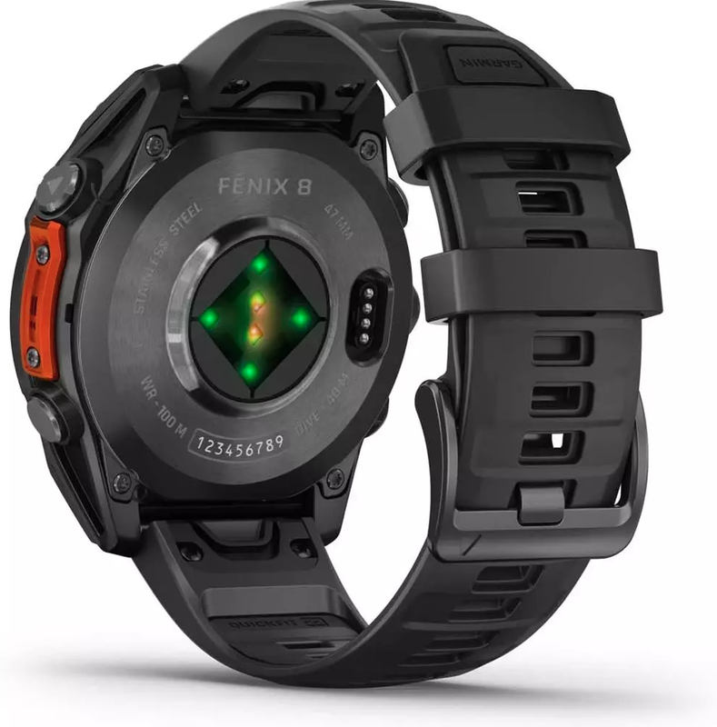 Das Aussehen der Fenix 8 ähnelt der Fenix 7 Pro Sapphire Solar. Fotos von der Rückseite der Uhr zeigen verschiedene Sensoren, darunter den Elevate 5 Herzfrequenzmesser. Die Uhr wird ein wasserdichtes Gehäuse bekommen. Sie wird bis zu einer Tiefe von 100 Metern untergetaucht werden können.