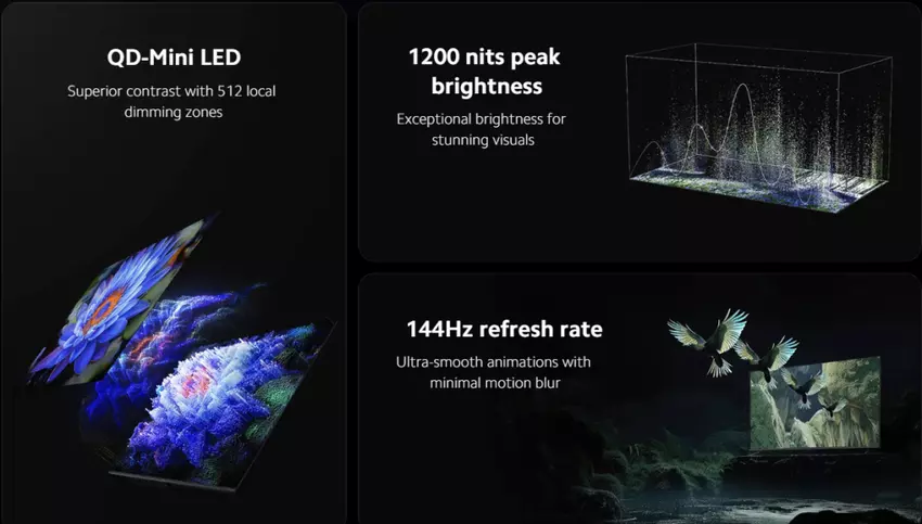 Dieses Modell verfügt über ein Vollbild-Metalldisplay mit QD-Mini-LED-Technologie, die 512 unabhängige Dimmzonen für verbesserten Kontrast bietet. Die maximale Helligkeit des Fernsehers beträgt 1200 nits, was eine hervorragende Bildqualität auch bei schwierigen Lichtverhältnissen garantiert.
