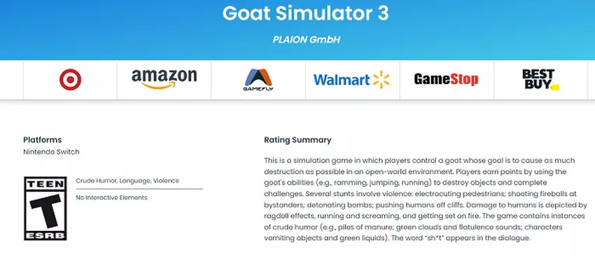 Wie auch auf anderen Geräten hat die Goat Simulator-Fortsetzung auf der Nintendo Switch ein "T"-Rating erhalten und darf von Kindern ab 13 Jahren gespielt werden.