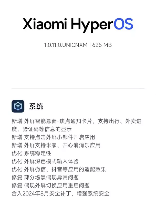 Die Firmware wurde mit der HyperOS 1.0.11.0 UNICNXM Buildnummer veröffentlicht und wiegt 625 MB. Das System wurde bereits in Wellen an die Geräte verteilt. Sie können das Vorhandensein von OTA in den Einstellungen des Geräts überprüfen.