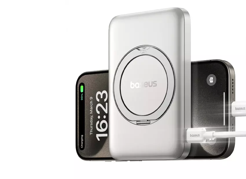 Die Rede ist von der Baseus Magnetic Rotating Stand Power Bank. Die Neuheit hat ein Volumen von 5000 mAh und unterstützt das magnetische Laden mit MagSafe bis zu 15W. Das Gerät verfügt über einen integrierten Ständer, der sich um 360 Grad drehen lässt.