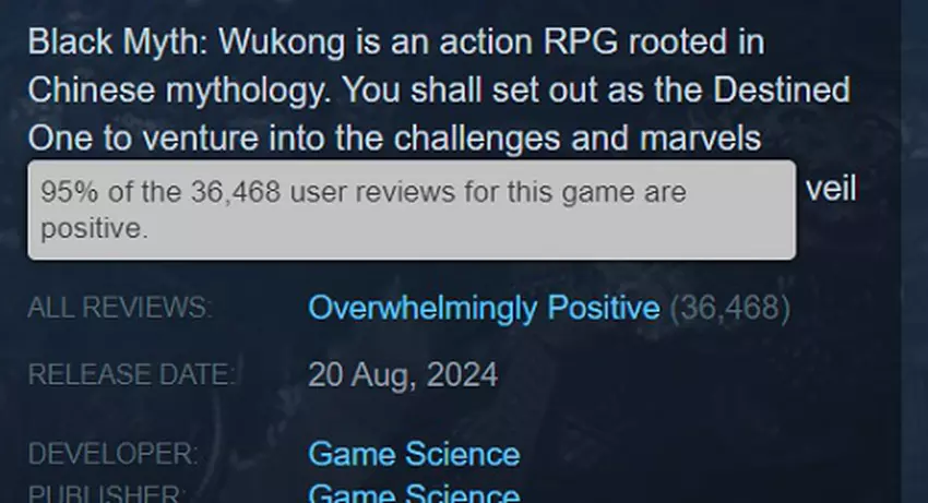 Black Myth: WuKong erhält eine riesige Anzahl von begeisterten Kritiken, auf Steam erreichte ihre Zahl 95% mit 36,5 Tausend Bewertungen. Die Spieler loben absolut alle Elemente des Spiels: Gameplay, Story, visueller Stil, Kampfsystem, technische Ausführung und bemerken das Fehlen vieler störender Aspekte, die in westlichen Spielen üblich sind.